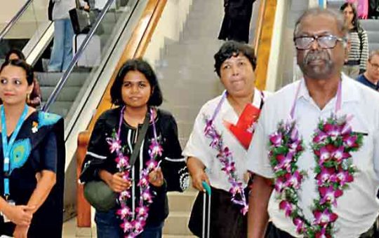 Felix Beslin Pereira, Reena Fernandez and Ann Cristina Pereira, a family from Thiruvananthapuram, India who arrived on SriLankan Airlines flight...