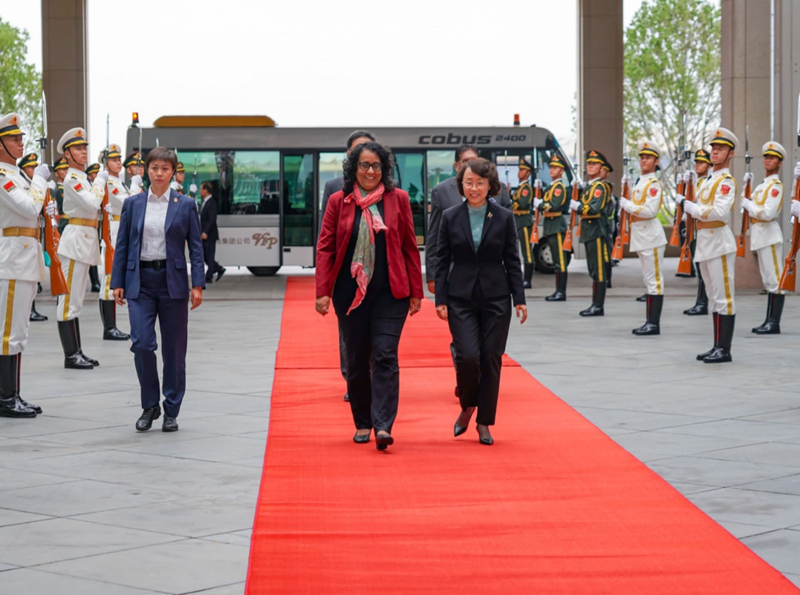 On her arrival, she was welcomed by Ms. Cao Shumin, Minister of the National Radio and Television Administration.