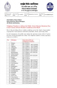 Local Telephone Numbers Issued for Reporting Disaster Situations 2 months ago admin END/GONP/MMP/29112025 Share This : Continue Reading Previous President Urges Government and Opposition Representatives to Unite and Serve the People during This Difficult TimeNext India Reaffirms Strong Support to Sri Lanka in Disaster Response – PM Modi More Stories Local President calls for unity and determination to rebuild Sri Lanka in his Independence Day message 2 days ago admin Local The cost of impunity for slain Tamil journalists in Sri Lanka 3 days ago admin Foreign Local Exposition of Holy Devnimori Relics of Lord Buddha in Sri Lanka 3 days ago admin Leave a Reply Cancel replyYour email address will not be published. Required fields are marked *Comment * Name * Email * Website Save my name, email, and website in this browser for the next time I comment.